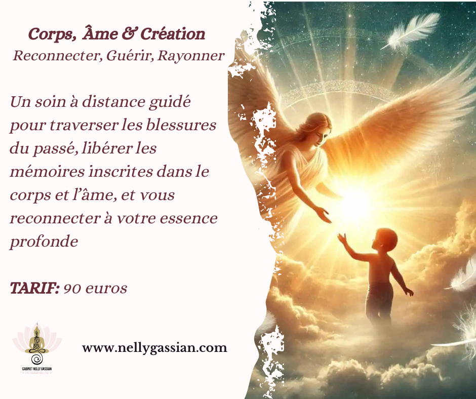 - Un soin énergétique à distance, réalisé dans un espace sécurisé et centré sur la thématique choisie. Ce soin agit sur les plans émotionnel, subtil et parfois transgénérationnel.